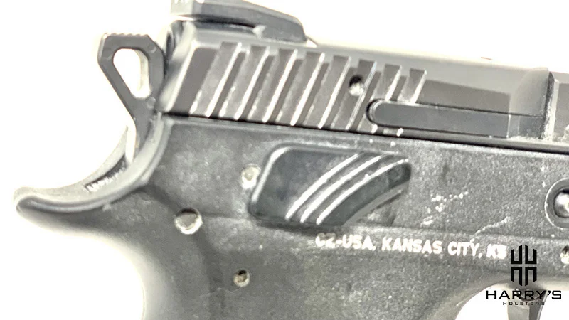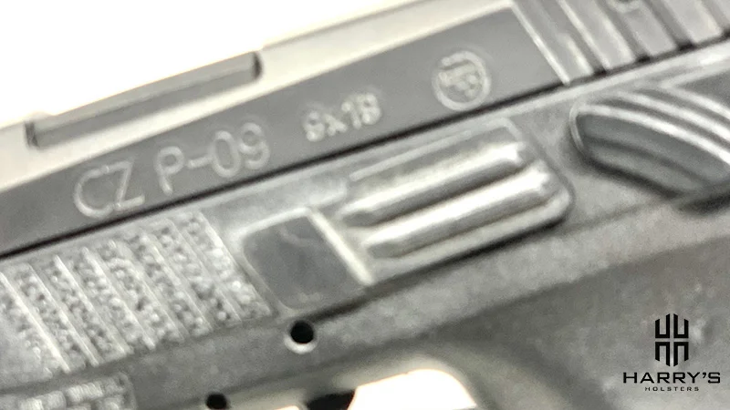 The slide stop on the CZ P09 also functions as a takedown lever. Similar to the docker and thumb safety it sits close to ⅛ of an inch off the gun and very high on the slide.