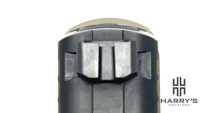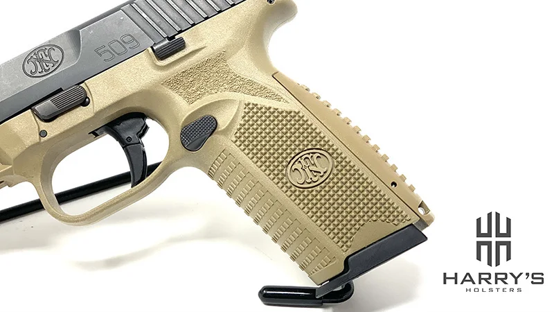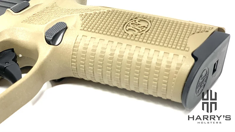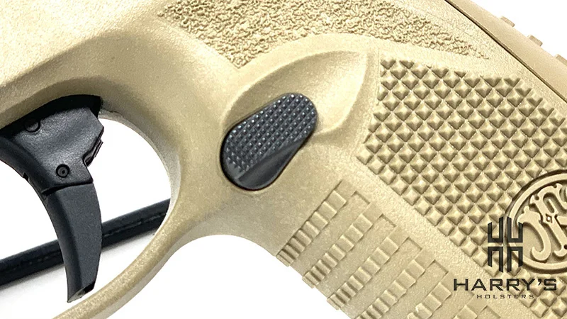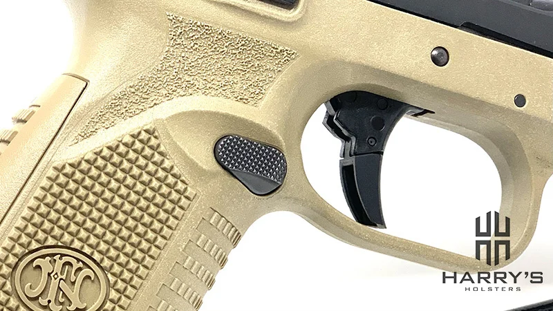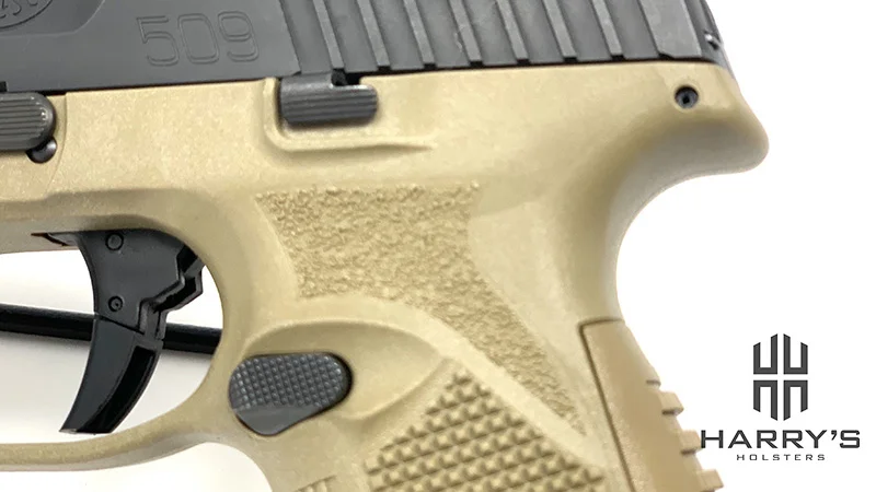 The FN 509 magazine release has built-up areas in the frame around the magazine release, so you don’t have to worry about the magazine being inadvertently disengaged.