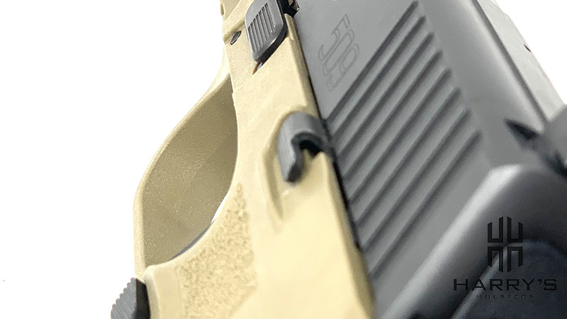 They are guarded against the bottom by blocking built into the frame so you won’t inadvertently lock the slide back by pressing the slide stop up with your palm when you’re gripping the gun.