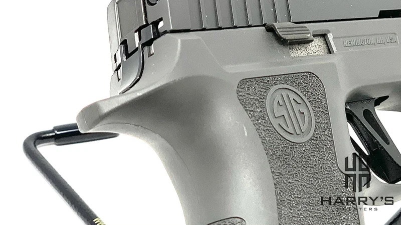 The Sig P320 tungsten frame has a slightly abrasive texture even in areas that don’t have texture. The legion frame feels like it’s made of very hard chalk. There is matching molded-in texturing on the front strap, back strap, and the side’s.